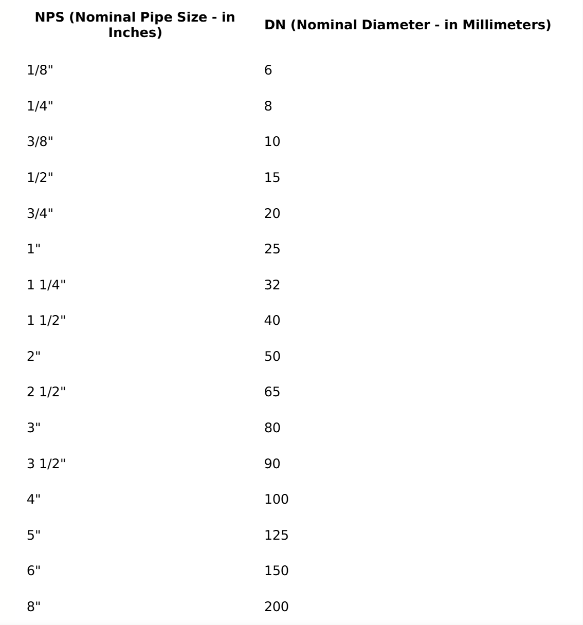 1" × 25 = डीएन25 2" × 25 = डीएन50 4" × 25 = डीएन100