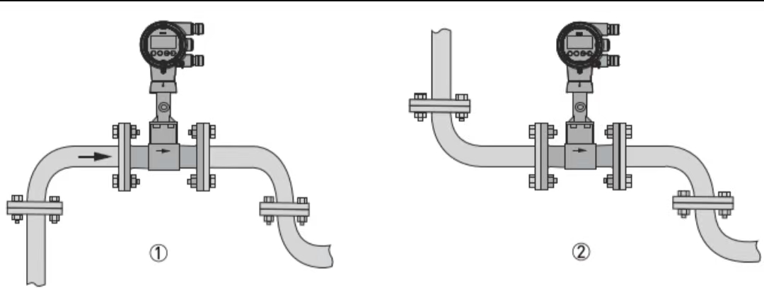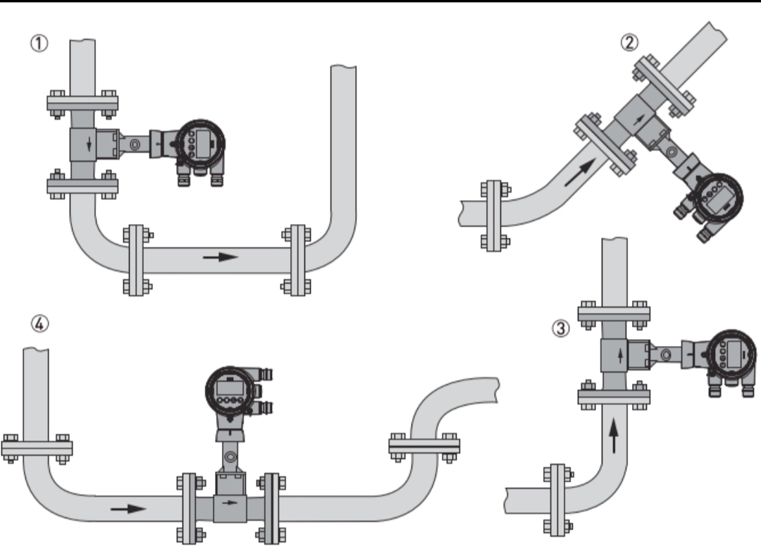 गैस/भाप अनुप्रयोगों के लिए, पाइपलाइन हमेशा गैस से भरी रहती है। इसलिए, प्रवाहमापी को ऊर्ध्वाधर ऊपर की ओर प्रवाह, ऊर्ध्वाधर नीचे की ओर प्रवाह, या क्षैतिज अभिविन्यास में स्थापित किया जा सकता है। हालाँकि, इसे निचले बिंदुओं पर स्थापित नहीं किया जाना चाहिए। अनुशंसित स्थापना पद हैं: