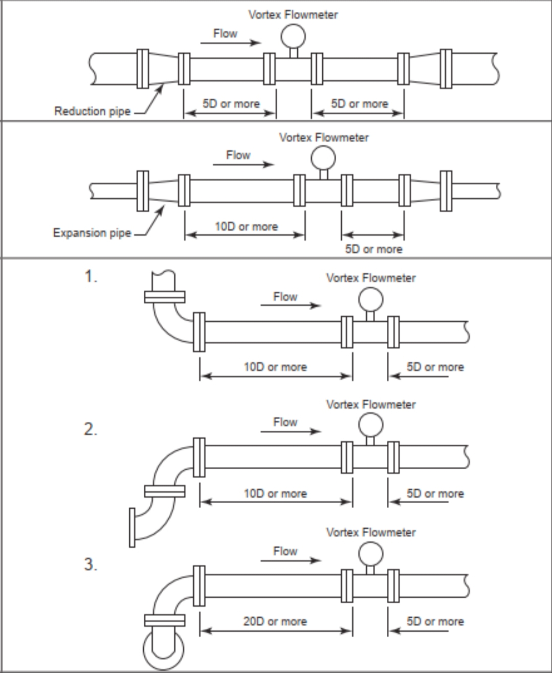 3. सीधे पाइप अनुभाग अपस्ट्रीम और डाउनस्ट्रीम (यदि तापमान और दबाव उपकरणों की आवश्यकता होती है, तो उन्हें फ्लोमीटर के डाउनस्ट्रीम में स्थापित किया जाना चाहिए। डाउनस्ट्रीम उपकरण भी सीधे पाइप अनुभाग के बाहर स्थित होने चाहिए। कई उपकरणों के लिए अनुशंसित व्यवस्था क्रम है: फ्लोमीटर, दबाव ट्रांसमीटर, तापमान ट्रांसमीटर)। आम तौर पर, निर्माता के उत्पाद नमूने (या उपकरण मैनुअल के अनुसार 15डी अपस्ट्रीम और 5डी डाउनस्ट्रीम की सामान्य दिशानिर्देश) में निर्दिष्ट सीधी पाइप लंबाई आवश्यकताओं को देखें। पाइपिंग इंजीनियरिंग टीम को भंवर प्रवाहमापी के लिए अपस्ट्रीम और डाउनस्ट्रीम सीधी पाइप आवश्यकताओं के बारे में पहले से सूचित करें। एक बार उपकरण निर्माता का चयन हो जाने के बाद, निर्माता के विनिर्देशों के अनुसार स्थापना आवश्यकताओं की पुन: पुष्टि की जानी चाहिए।